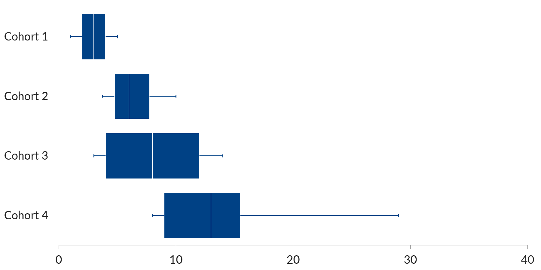 Common in high school statistics courses, but not so common in the real world. These graphs display the min, max, mean or median, and quartiles 1 and 3.