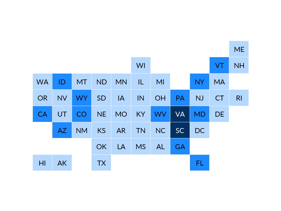 Imagine a traditional geographic map where Texas looks like Texas and Delaware looks like Delaware. No matter how dark you shade in the tiny states like Delaware, they’ll always be dwarfed by larger states like Texas. In traditional geographic maps, our brains are trying to decode information based on both size and saturation. In tile grid maps, each state is the same size and shape. You can use squares, hexagons, or even smiley faces to represent each state.