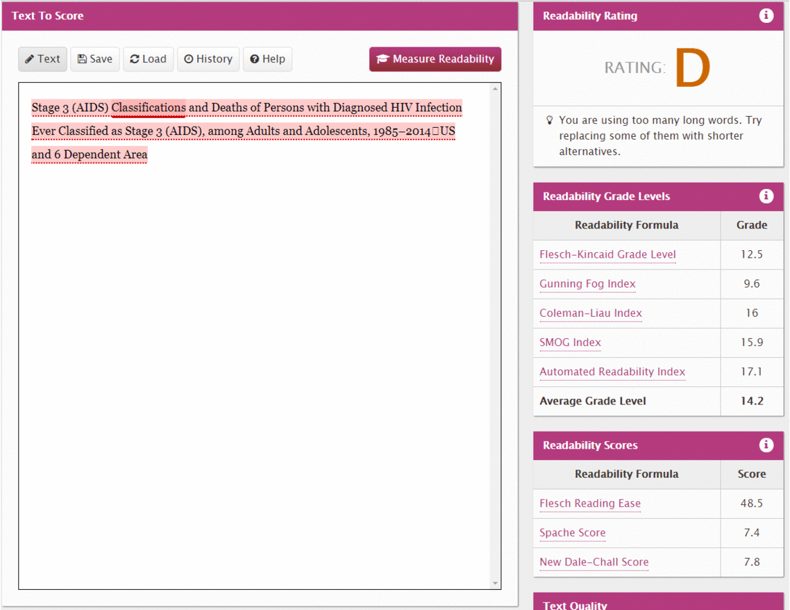 I pasted the before title into Readable’s website: “Stage 3 (AIDS) Classifications and Deaths of Persons with Diagnosed HIV Infection Ever Classified as Stage 3 (AIDS), among Adults and Adolescents, 1985-2014 US and 6 Dependent Areas.”