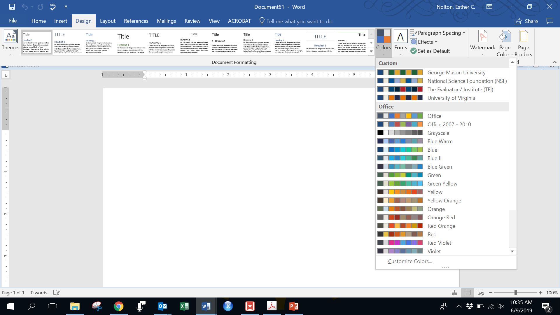 I was always reentering colors for new presentations and documents for the same company. This was exhausting and frustrating! I had enough sense to write down the RGB codes on a Post-It note for one company’s palette that I most frequently used and stuck it on the corner of my monitor. However, Ann taught us to save frequently used color themes in our Microsoft programs (see figure below) so that they could be easily selected and used across documents. Once saved in one program, it would be available across all Microsoft programs on that computer. Voila!
